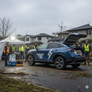 電気自動車は通常の車よりも大きいバッテリーを積んでいるため、停電した施設などに電力を供給しています。